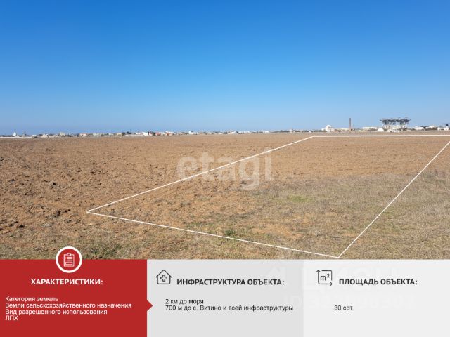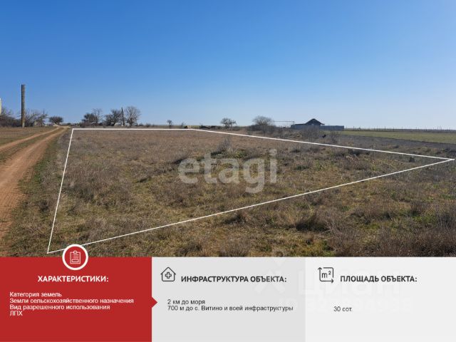 В продаже участок 30 соток (ЛПХ) — отличная инвестиция в недвижимость Крыма! Участок расположен всего в 2 км от моря и 700 м от посёлка Витино с развитой инфраструктурой. Рядом проходят асфальтированная дорога и линии электропередач — коммуникации доступны. Земли сельскохозяйственного назначения с разрешённым использованием ЛПХ открывают возможности для выращивания сельхозпродукции, строительства дачи, модульного дома или размещения некапитальных строений. Большая площадь 30 соток позволяет реализовать масштабные проекты или в будущем разделить участок. Это выгодное вложение в регионе с устойчивым ростом цен на землю. Крым — территория с высоким инвестиционным потенциалом и растущим спросом на недвижимость. Не упустите возможность приобрести землю в перспективной локации! Звоните для деталей и просмотра. МЫ ГАРАНТИРУЕМ ФИНАНСОВУЮ БЕЗОПАСНОСТЬ ДЛЯ НАШИХ КЛИЕНТОВ. Полное юридическое сопровождение сделки. Высокий шанс одобрения ипотеки. Звоните, с удовольствием ответим на ваши вопросы! Код пользователя: 192745 Номер в базе: 11997300