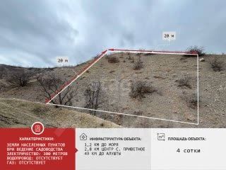 Продам участок в с. Приветное, г. Алушта. 4 сотки, назначение: садоводство. Участок квадратный. Кооператив свежий, больше 200 домов. Расположен в ущелье, до моря 500м. На перспективу благоустройства кооператива берём 5 лет. Будет асфальтированный подъездной путь от г. Белогорска, озеро, зона отдыха с беседками, центральный водопровод. На данный момент можно подъехать со стороны Алушты и Судака. Документы РФ, межевание. Кадастровый номер 90:15:070102:1065