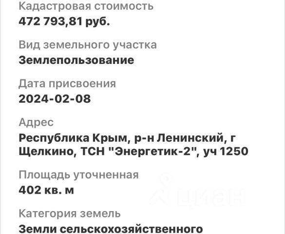 Продаётся земельный участок в СНТ Энергетик-2, ул. Преображенская, г. Щёлкино, Ленинский район, Республика Крым. Участок общей площадью 400 м. кв., с разрешённым видом использования: ведения садоводства. Участок ровный, огорожен с трёх сторон забором, с широким фасадом. К участку есть хороший подъездной путь. К участку подведено электричество, вдоль всех участков по улице проходит новая труба центрального водоснабжения и точка подключения к интернету. Рядом жилые дома, проживают добропорядочные, тихие соседи. СНТ Энергетик-2- это большой садоводческий кооператив, с плотной застройкой и круглогодичным проживанием садоводов. В кооперативе круглый год: электричество, водоснабжение, интернет, вывоз мусора, отсыпка дорог. От участка до остановки общественного транспорта Нептун- 150 м., до берега Азовского моря с шикарными видами на экзотические бухты- 400 м., до города Щёлкино- 1 км. В шаговой доступности АЗС Атан, церковь, семейный отель Riga Village Resort, курортный комплекс Villa Campari и другие. До Ж/Д станции Семь Колодезей- 18 км., до Крымского моста- 65 км. Рассматривая данное предложение, у Вас есть уникальная возможность построить коттедж в экологически чистом районе Крыма для круглогодичного проживания и отдыха семьи с возможностью прописки, или построить небольшой гостевой домик. Город Щелкино - это самый молодой город в Крыму, располагается на берегу Азовского моря. В городе есть вся необходимая инфраструктура для комфортного отдыха: продуктовые магазинчики, салоны красоты, парикмахерские, аптеки, WB, Ozon, ДК, центральная площадь с качелями и зонами отдыха, рынок, сетевые магазины, скверы, парки, новая набережная с многочисленными барами, ресторанами, бистро, гастробарами, кафетериями, столовыми и т.д. Если Вы приобретёте данный участок, то сможете каждый вечер наслаждаться красивейшими закатами и тёплым Азовским морем! Кадастровый номер: 90:07:010301:115 Цена земельного участка: 850 000 рублей. Собственник: один. Документы Выписка из ЕГРН.