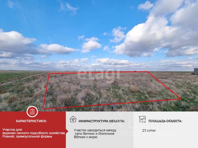 Продается участок ЛПХ 5 соток, в 1 километре от песчаного пляжа возле села Витино. Участок ровный, прямоугольной формы, 15 на 30 метров. В 200 метрах от участка проходит линия электропередач. Категория земель: Земли сельскохозяйственного назначения, ВРИ: Ведение личного подсобного хозяйства на полевых участках. На данном участке есть возможность построить дом на сваях или другой объект не капитального строительства. Возле села Витино благодаря хорошим песчаным пляжам и кристально чистому морю идет активная застройка и развивается туристический бизнес. От участка до села Витино всего 600 метров, до города Евпатория 16 километров. Документы РФ, участок готов к продаже. МЫ ГАРАНТИРУЕМ ФИНАНСОВУЮ БЕЗОПАСНОСТЬ ДЛЯ НАШИХ КЛИЕНТОВ. Полное юридическое сопровождение сделки. Высокий шанс одобрения ипотеки. Звоните, с удовольствием ответим на ваши вопросы! Код пользователя: 84414 Номер в базе: 3255965