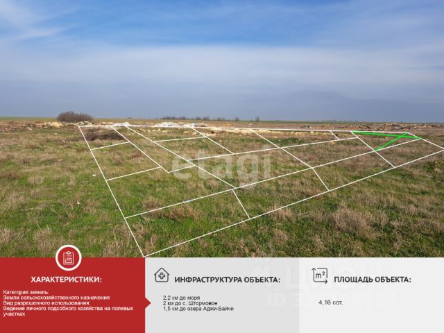 Продаётся участок между сёлами Штормовое и Хуторок. До асфальтированной дороги 200 м. Участок угловой. Категория земель — земли сельскохозяйственного назначения с разрешённым видом использования "Ведение личного подсобного хозяйства (ЛПХ)". Участок расположен в выгодной местности: всего 2,2 км до моря и 1,4 км до озера. Есть удобная подъездная дорога, а в пяти минутах езды — федеральная трасса "Таврида", что обеспечивает отличную транспортную доступность. Все формальности урегулированы: проведено межевание, документы полностью готовы к сделке. Участок не огорожен. Свобода для планирования и обустройства по вашему вкусу. Отличная возможность приобрести землю в перспективном районе с развивающейся инфраструктурой. Звоните прямо сейчас, чтобы узнать детали и инвестировать в будущее! МЫ ГАРАНТИРУЕМ ФИНАНСОВУЮ БЕЗОПАСНОСТЬ ДЛЯ НАШИХ КЛИЕНТОВ. Полное юридическое сопровождение сделки. Высокий шанс одобрения ипотеки. Звоните, с удовольствием ответим на ваши вопросы! Код пользователя: 192745 Номер в базе: 10439310
