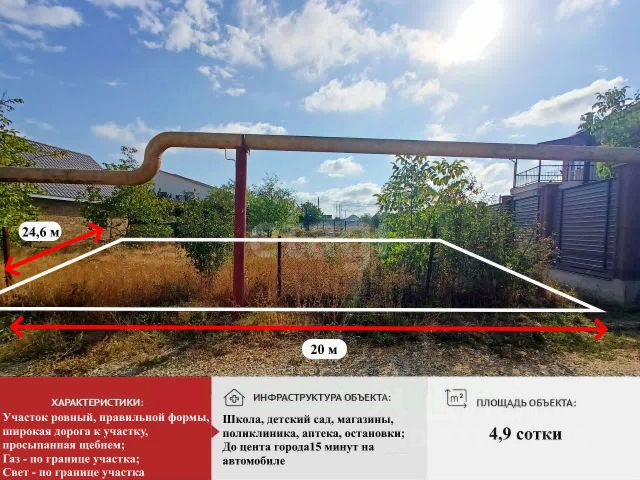 Земельный участок имеет ровный рельеф и конфигурацию. В 100 м от земельного участка находится сосновый лес с шикарными видами на поля и предгорье Крыма. Бурно развивающийся микрорайон города с удобной транспортной развязкой (ходят маршрутки 14, 52, 88), магазинами, хорошими соседями, всегда готовыми прийти на взаимовыручку. В 2026 г будут вести водопровод и канализацию (см. фото), после чего капитально асфальтироваться дороги (сейчас грейдированная, хорошо утрамбованная щебёнка). До автобусной остановки и магазинов 5 минут пешком - центр Каменки. 4-я остановка.