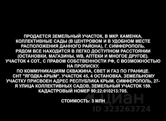 Продается участок, 4 Сотки, город Симферополь,27 улица коллективных садов! Каменский массив — это часть города Симферополя с городской пропиской, обладающее развитой инфраструктурой. Здесь вы найдете все необходимое для комфортной жизни: магазины продовольственных и хозяйственных товаров, остановки общественного транспорта, а также пункты выдачи товаров. Категория земель: Земли населённых пунктов, предназначенные для ведение садоводства. Преимущества участка: - Ровный, правильной прямоугольной формы; - Площадь 4 сотки — идеальный размер для строительства вашего дома мечты; - Сухой, имеется садовый домик; - Не угловой, что обеспечивает дополнительные возможности для планировки; - Удобный подъезд к участку по укатанной грунтовой дороге, отсыпанной щебнем. Коммуникации: - Электричество — подключено, установлен счётчик; - Газопровод — по границе; - Водоснабжение — имеется скважина. Локация: Вторая улица от центральной асфальтированной улицы. Расстояние до центра г. Симферополь всего 2 км, а до берега Черного моря (г. Алушта) около 60 км. Не упустите возможность стать владельцем этого замечательного участка! Звоните и записывайтесь на просмотр уже сегодня! Номер объекта: 3963468 Код пользователя: 179953 Номер в базе: 3963468