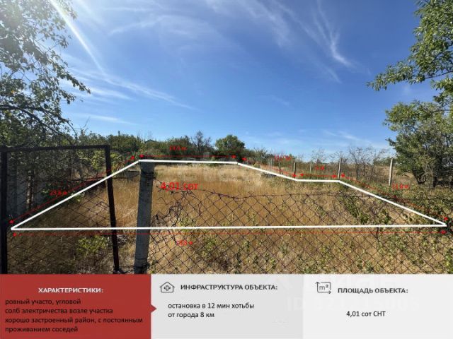 Продам участок 4,14 сотки в СПК "Вита" (Илюшино), Урожайновское сельское поселение. Идеальный вариант для строительства дома по семейной ипотеке! Основные параметры: Площадь: 4,14 соток (ровный, прямоугольной формы) Расположение: СПК "Вита", мкр. Илюшино, Урожайновское сельское поселение Подъезд: через Киевский район г. Симферополь Активная застройка район СПК быстро развивается, что гарантирует рост стоимости недвижимости. Соседи активно строятся. Инфраструктура: СПК расположен рядом с с. Урожайное и с. Живописное, в которых имеются различные магазины, маркетплейсы, школы, детские сады, амбулатории, общественные пространства, дома культуры Отличная транспортная доступность всего 15 минут до города на автомобиле, удобный выезд на трассу "Таврида", рядом автобусная остановка. Коммуникации: Электричество, уже на улице (можно подключаться) газ перспектива 2026 года Вода можно пробурить скважину. Отличная инвестиция активная застройка гарантирует рост цены участка Звоните прямо сейчас для уточнения деталей и организации просмотра! Номер объекта: 10823382 МЫ ГАРАНТИРУЕМ ФИНАНСОВУЮ БЕЗОПАСНОСТЬ ДЛЯ НАШИХ КЛИЕНТОВ. Полное юридическое сопровождение сделки. Высокий шанс одобрения ипотеки. Звоните, с удовольствием ответим на ваши вопросы! Код пользователя: 189436 Номер в базе: 10823382