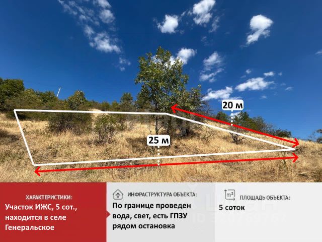Продаётся земельный участок ИЖС площадью 5 соток в селе Генеральское на улице Центральной. Участок расположен в экологически чистом районе, в окружении гор и лесов. Рядом находятся водоёмы и природные достопримечательности. Участок имеет ровный рельеф, на нём проведены необходимые коммуникации: электричество, вода. На территории участка можно построить дом, разбить сад или огород, обустроить зону отдыха. Удобное расположение позволяет быстро добраться до города и всех необходимых объектов инфраструктуры. ЗВОНИТЕ!!! Отвечу на все интересующие вопросы, организую показ. Номер объекта:9261790 МЫ ГАРАНТИРУЕМ ФИНАНСОВУЮ БЕЗОПАСНОСТЬ ДЛЯ НАШИХ КЛИЕНТОВ. Полное юридическое сопровождение сделки. Высокий шанс одобрения ипотеки. Звоните, с удовольствием ответим на ваши вопросы! Код пользователя: 142214 Номер в базе: 9261790