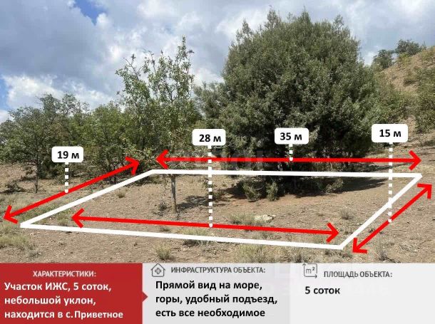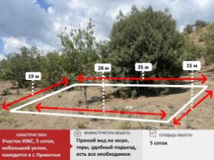 Участок мечты с видом на море и горы в с. Приветное! Предлагаем вашему вниманию уникальный участок в живописном селе Приветное! Этот участок площадью 5 соток идеально подходит для строительства вашего загородного дома или дачи. Село Приветное располагает развитой инфраструктурой: в шаговой доступности находятся магазины, кафе, школы и медицинские учреждения. В непосредственной близости расположены пляжи, где вы сможете проводить время с семьей и друзьями, а также насладиться активными водными видами спорта. Удобные транспортные развязки обеспечивают легкий доступ к ближайшим городам и курортам. Участок готов к сделке и свободен от обременений. Мы предлагаем гибкие условия оплаты, включая возможность рассрочки, что позволит вам удобно спланировать свои финансовые расходы. Все документы подготовлены, и мы готовы к быстрой сделке. С компанией "Этажи" вы получите профессиональную поддержку на каждом этапе покупки. Наша команда экспертов поможет вам не только выбрать идеальный участок, но и проведет вас через все этапы сделки, обеспечивая полную прозрачность и безопасность. Мы ценим каждого клиента и стремимся сделать вашу покупку максимально комфортной и выгодной! Не упустите возможность стать владельцем участка своей мечты! Номер объекта 5718722 МЫ ГАРАНТИРУЕМ ФИНАНСОВУЮ БЕЗОПАСНОСТЬ ДЛЯ НАШИХ КЛИЕНТОВ. Полное юридическое сопровождение сделки. Высокий шанс одобрения ипотеки. Звоните, с удовольствием ответим на ваши вопросы! Код пользователя: 142214 Номер в базе: 5718722