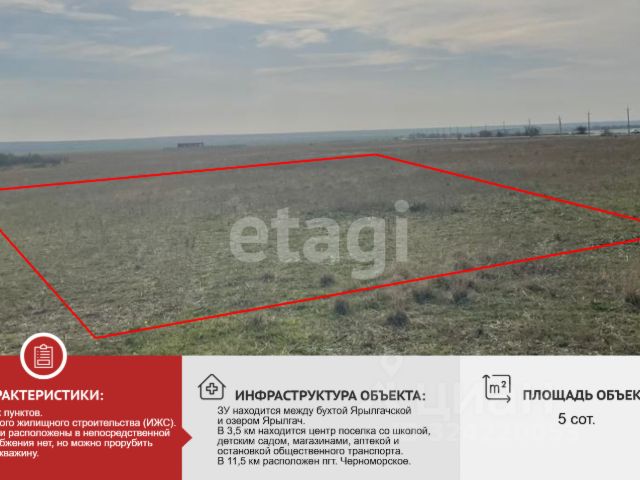 Вашему вниманию участок участок 5сот. ИЖС-до Евпатории 70 км-до Аэропорта 140 км-до Симферополя 150 кмВ посёлке центральные водоснабжение и газ.Также Межводном есть все для комфортного проживания:средняя общеобразовательная школа, амбулатория, дом культуры, библиотека, отделение почты, отделение банка, аптека, магазины, кафе и рестораны, рынок и АЗС, гостиницы.Курортный сезон в Межводном начинается с мая (вода прогревается до +18 уже) и заканчивается в октябре (воздух +26, вода +18-22). При этом, пиковый сезон — июль, август, когда температура воды +23-25 градусов, а воздуха +30-35. Кроме песчаного пляжа, в Межводном есть и небольшие живописные скалы. В Межводном нет и сильных течений, что положительно сказывается на температуре воды.Документы РФ полностью готовы к сделке! Номер объекта: #1/544106/14415