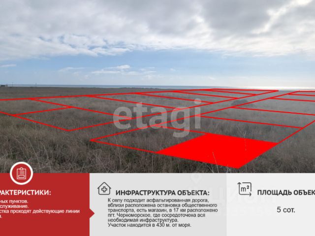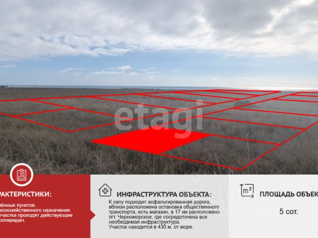 Продаётся земельный участок площадью 5 соток в селе Марьино, Окунёвского сельского поселения, Черноморского района. Участок относится к землям населённых пунктов, к категории сельскохозяйственного назначения. Участок идеально подходит для инвестиций в туристическую инфраструктуру, так как расположен всего в 430 метрах от моря, на первой линии. Это позволяет построить гостиницу или гостевой дом, что обеспечит стабильный спрос и высокую доходность, особенно в курортный сезон. Территория находится в тихой зоне вдали от основных дорог, при этом обладает удобной транспортной доступностью — к селу подходит асфальтированная дорога, вблизи расположена остановка общественного транспорта, расстояние до села Окунёвка, составляет 3,5 км, а в 17 км расположено пгт. Черноморское, где сосредоточена вся необходимая инфраструктура. По границе участка проходят действующие линии электропередач, что упрощает и удешевляет процесс подключения. Наличие продуктового магазина решает вопрос с первоочередными потребностями. Участок полностью подготовлен к сделке, все документы соответствуют законодательству РФ. Звоните, отвечу на все вопросы, проведу показ. Код пользователя: 192814 Номер в базе: 10248529