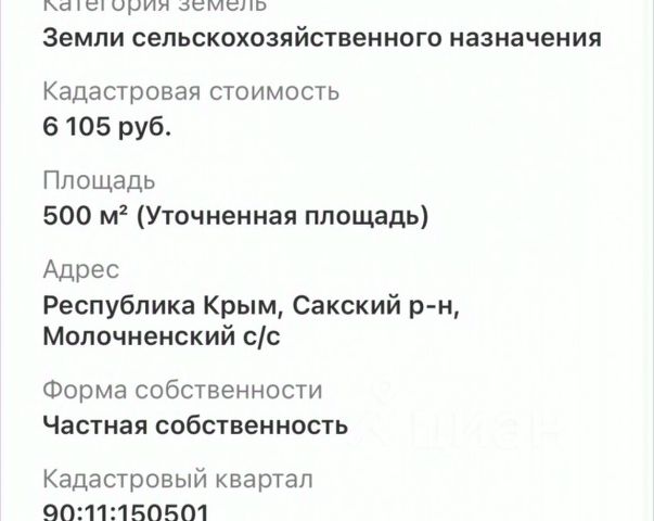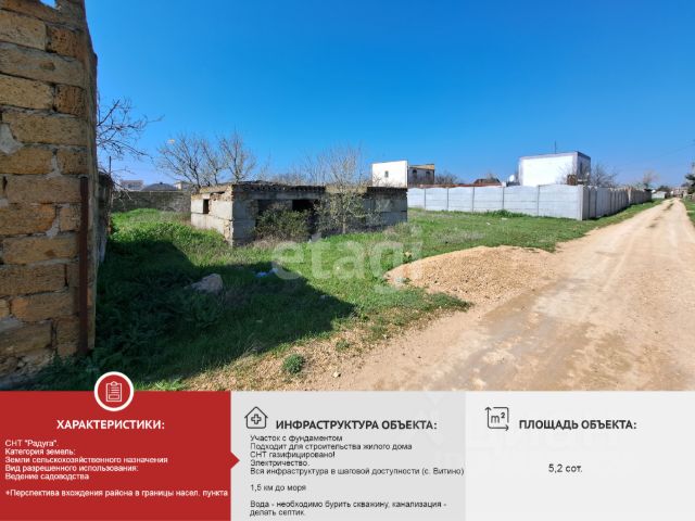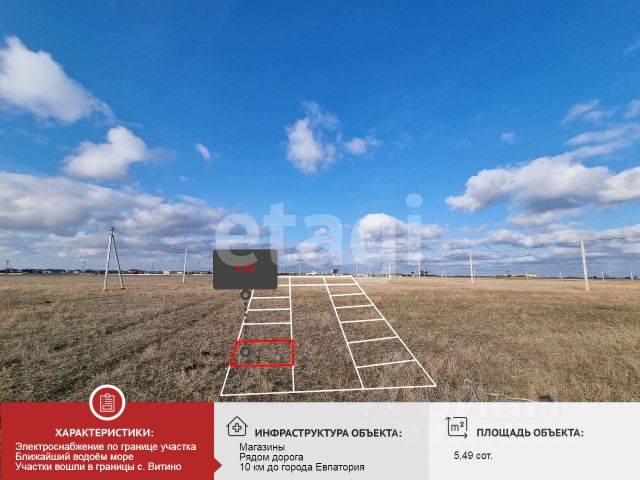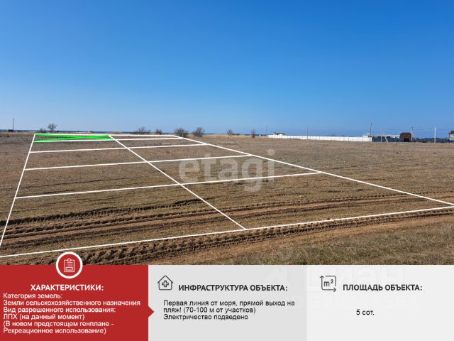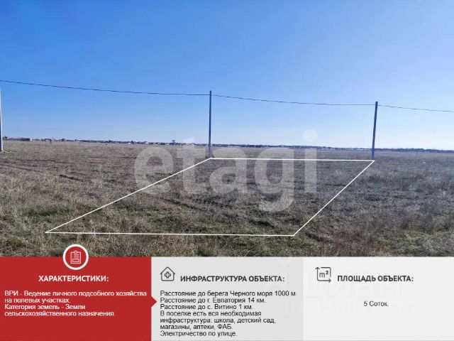 Продаётся земельный участок размером 5 соток в комфортабельном коттеджном посёлке на расстоянии 650 м от лазурного берега Черного моря. Коттеджный поселок расположен в Сакском районе: 14 км от г. Евпатория, 3 км от п. Молочное, 2 км от п. Витино. Территория обеспечена всеми коммуникациями: электричеством, водоснабжением и газопроводом. Непосредственно на этот участок заведен свет и имеется свой лицевой счет в Крым Энерго. Это превосходное место для постройки собственного дома или запуска предпринимательской деятельности. Развитая инфраструктура посёлка и близость к морю делают это предложение особенно привлекательным. Не упустите момент! Инвестируйте в комфорт и отдых. Возможен онлайн показ и удаленная сделка. Документы РФ Готовы к сделки! Номер объекта: #1/550008/23345
