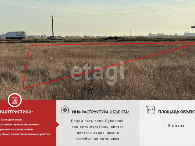 Продается участок правильной формы в Суворовском сельском совете, рядом с трассой Евпатория-Черноморское, площадью 5 соток.Есть несколько участков, есть возможность объединить. Назначение земли - ведение личного подсобного хозяйства, можно построить сарай, хоз. постройки, домик или дачу на сваях, пробить скважину и установить септик. Рядом с участком находится СПК "Чайка", До города Евпатория 4 км, до Евпаторийского пляжа 7 км. В 5 минутах по трассе : АЗС, школа, магазины. Тихое спокойное место как для проживания так и для ведения бизнеса. Один собственник!Документы РФ готовы к сделке!Звоните!С удовольствием проведу показ! МЫ ГАРАНТИРУЕМ ФИНАНСОВУЮ БЕЗОПАСНОСТЬ ДЛЯ НАШИХ КЛИЕНТОВ. Полное юридическое сопровождение сделки. Высокий шанс одобрения ипотеки. Звоните, с удовольствием ответим на ваши вопросы! Код пользователя: 145644 Номер в базе: 3301743