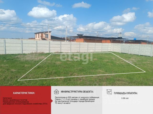 Продаётся отличный Участок 5,77 соток. В Собственности! Ближайший пригород Евпатории. село Уютноное. Категория: земли населенных пунктах. Вид разрешённого использования: садоводство. Участок ровный, прямоугольной формы. Имеется гараж. Документы в соответствии с законодательством РФ в наличии. Один собственник! Отличное месторасположение для постоянного проживания. Развитая инфраструктура. Проведено межевание. Присвоен адрес. Удобная локация. Со всех сторон по участку установлен забор. Удобный подъезд к участку по дороге. Вокруг жилые дома, соседи проживают круглогодично. Рядом магазины, аптеки, школа, дет.садик, остановки общественного транспорта, рынок, ледовый дворец спорта, почта, амбулатория детская площадка, футбольное поле и др. До города 5 км, до моря 1.5 км. 5 минут езды на авто. На участке построен гараж.