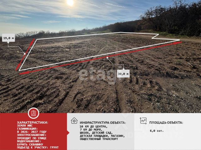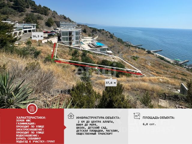 Земельный участок 6,09 соток, со сложным рельефом, с видом на Крымские горы, расположен в селе Лучистое г. Алушта, в ста метрах от основной улицы. Вокруг ведется активная малоэтажная застройка.