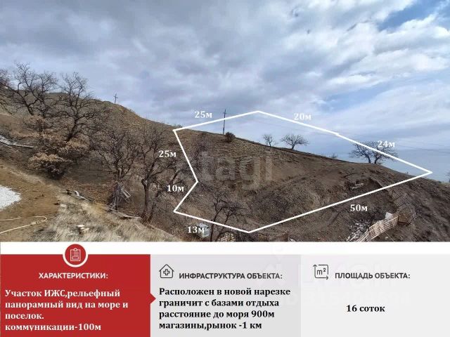 Продаётся видовой участок у моря в Керчи! Не упустите шанс обзавестись земельным участком в живописном месте — предложение актуально до 05.03.2026 г. Основные характеристики: площадь: 6 соток (605 м 2 ); кадастровый номер: 90:19:010116:8562; категория земель: земли населённых пунктов; разрешённое использование: ИЖС; форма участка: прямоугольная; рельеф: равнинный. Местоположение: г. Керчь, улица Пермская. Инфраструктура и окружение: в шаговой доступности — магазины и школа; остановка общественного транспорта — 250 м; до моря и песчаного пляжа — 900 м; электричество — рядом с участком; газ — планируется в ближайшее время; вода — скважина (планируется подключение к центральному водопроводу). Юридическая информация: форма собственности: частная (один взрослый собственник); обременения и ограничения: отсутствуют; документы полностью готовы к сделке. Варианты оплаты: наличные, ипотека. Сделайте шаг навстречу жизни у моря — звоните и записывайтесь на просмотр! Земельный участок в республике Крым.