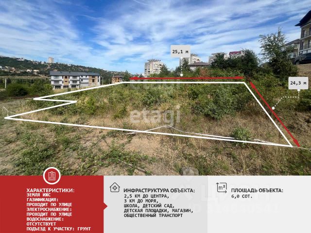 Код объекта: 1988456. Участок расположен в популярном районе "Рабочий уголок", всего в 10-15 минутах неспешной прогулки от морского побережья. По соседству находится пансионат "Дубна". Территория имеет ровный горный рельеф и находится в своем природном, неосвоенном состоянии, что дает новому владельцу полную свободу для планирования. С участка открывается живописный вид на город. При возведении двухэтажного дома из окон откроется панорама на морское побережье. Транспортная доступность отличная: до автобусной остановки — около 10 минут пешком. Коммуникации и перспективы: Инфраструктура в районе активно развивается. Электричество: Подстанция и сети "Крымэнерго" находятся в непосредственной близости.Водоснабжение и канализация: Магистральные сети проходят рядом с участком.Газ: Согласно официальным планам, проектирование и строительство газовых сетей запланировано на 2027 год. Трасса находится рядом.