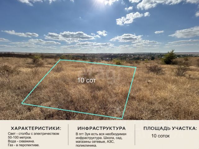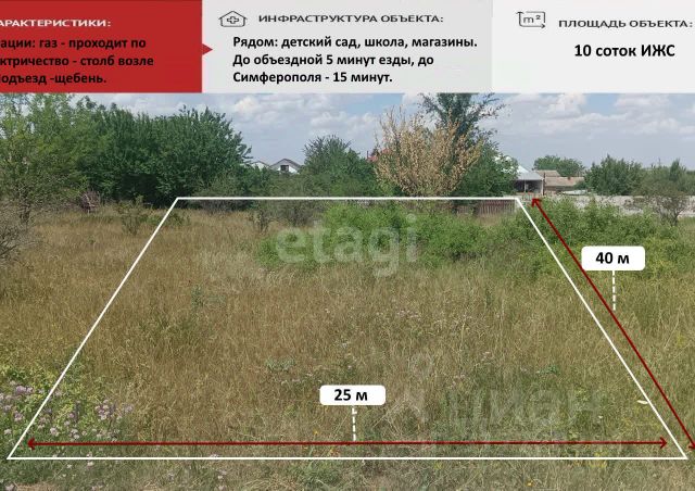 Продаётся земельный участок Местоположение и транспортная доступность Участок расположен в активно застраивающемся спальном районе. До Симферополя — 1015 минут на автомобиле. До трассы "Таврида" — 5 минут на машине. К участку ведёт грейдированная ровная дорога, расстояние до асфальта — 200 м. Инфраструктура В посёлке хорошо развита социальная и бытовая инфраструктура: 2 школы; 2 детских сада; магазины и супермаркеты; новая больница. В текущем году запланировано строительство спортивной школы. Коммуникации Рядом с участком проходят необходимые коммуникации: электричество — в 50 м от участка. К концу 2025 — началу 2026 года планируется газификация поселения, что повысит комфорт проживания и рыночную стоимость недвижимости. Преимущества локации до школы и детского сада — 5 минут на машине; удобная транспортная доступность; перспективное развитие района. Условия продажи Доступны различные варианты расчётов: наличный расчёт; ипотека; постоплата (строительство дома на участке). Участок полностью готов к сделке.