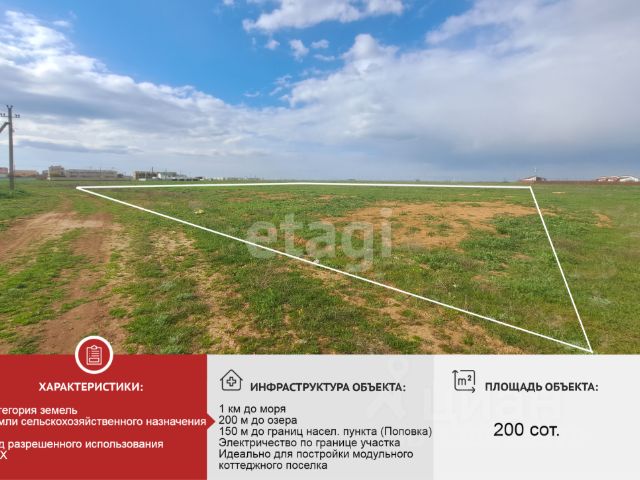 Продается уникальный земельный участок площадью 6,06 соток, расположенный в живописном уголке Новоивановского сельского совета, всего в 600 метрах от великолепного озера Донузлав. Этот участок на западном побережье Крымского полуострова — идеальное место для создания вашего загородного рая или успешного инвестиционного проекта! Участок ровный и слегка приподнятый, что обеспечивает потрясающий вид на озеро и его окрестности. На данный момент назначение земли — для личного подсобного хозяйства (ЛПХ), но согласно прогнозам, в ближайшие два года эти земли будут переведены в категорию рекреации, что значительно увеличит их стоимость. Это отличная возможность для тех, кто хочет вложить средства в перспективный объект! Планируется проведение электричества, вода - бурение неглубокой скважины. Газовая ветка проходит всего в 700 метрах от участка. В будущем здесь будет построен коттеджный поселок, что добавит ценности вашему вложению. Вы сможете добраться до своего нового участка всего за 50 минут от аэропорта Симферополь. В округе находятся множество достопримечательностей: озеро Лиман, коса Беляус, популярный пляж Майами с возможностью кайт-серфинга, а также исторический храм св. Варвары и парк Экстрим-Крым. Длинная береговая линия с белым песком создаст атмосферу уюта и спокойствия. Ближайшие населенные пункты — Медеведево и Новоивановка, расположенные менее чем в 4 км, предлагают все необходимые удобства: магазины, медицинские учреждения, школы и детские сады. Все документы готовы к продаже, и вы можете стать владельцем этого участка уже сегодня! Не упустите свой шанс! Цены МЫ ГАРАНТИРУЕМ ФИНАНСОВУЮ БЕЗОПАСНОСТЬ ДЛЯ НАШИХ КЛИЕНТОВ. Полное юридическое сопровождение сделки. Высокий шанс одобрения ипотеки. Звоните, с удовольствием ответим на ваши вопросы! Код пользователя: 181144 Номер в базе: 4317855