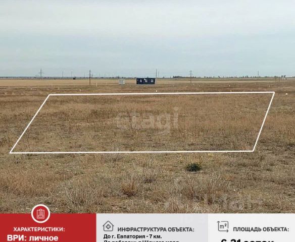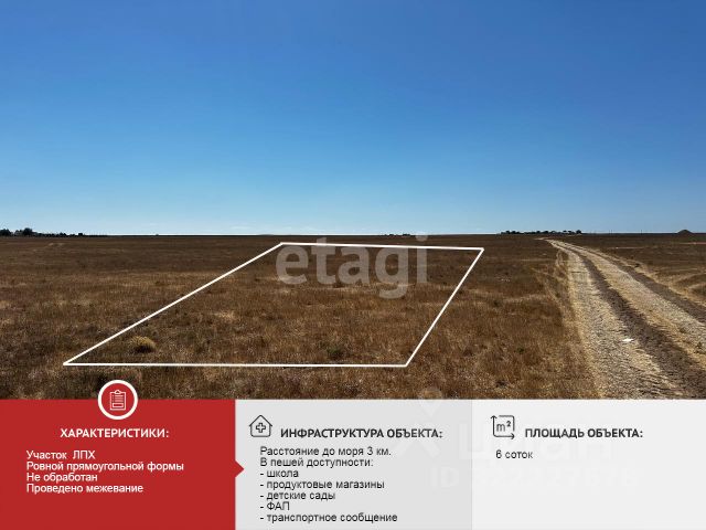 Продается участок площадью 6 соток, в 5 км. город Евпатория. Земля не обработана. Категория: земли сельского хозяйственного назначения. Вид разрешенного использования:ведение личного подсобного хозяйства на полевых участках. В 10 минутах езды находится село Суворовское с развитой инфраструктурой: продуктовые магазины, аптека, школа и детский сад обеспечивают базовые потребности жителей. До центра Евпатории можно добраться за 15 минут на автомобиле, что делает участок удобным вариантом для тех, кто ценит близость к городским удобствам, но предпочитает жить в спокойной загородной атмосфере. Расстояние до побережья Черного моря составляет всего 7 км, что позволяет совмещать повседневную жизнь с отдыхом у воды. Рядом с участком расположена автобусная остановка, обеспечивающая транспортную доступность для тех, кто не использует личный автомобиль. Звоните прямо сейчас ! МЫ ГАРАНТИРУЕМ ФИНАНСОВУЮ БЕЗОПАСНОСТЬ ДЛЯ НАШИХ КЛИЕНТОВ. Полное юридическое сопровождение сделки. Высокий шанс одобрения ипотеки. Звоните, с удовольствием ответим на ваши вопросы! Код пользователя: 167729 Номер в базе: 8519773