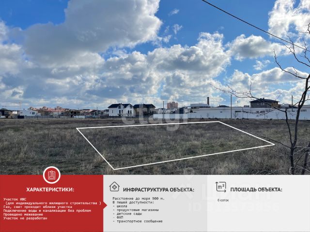 Объект 4143. Мечта у моря! Участок 6 соток под ИЖС в 1 км от пляжа Евпатории. Предлагаем вам уникальную возможность стать владельцем прекрасного земельного участка для строительства собственного дома в солнечной Евпатории! Почему этот участок — ваш идеальный выбор? Шаг до моря: Всего 1 километр отделяет вас от золотистых песков и ласковых волн Черного моря! Утренние пробежки по пляжу и вечерние прогулки под шум прибоя станут вашей прекрасной реальностью. Идеальное расположение: Участок находится в районе с хорошей транспортной доступностью. До центра Евпатории — всего несколько минут на машине. Готов к строительству: Категория земель: Земли населенных пунктов, разрешенное использование — Индивидуальное жилищное строительство (ИЖС). Кадастровый номер: 90:11:220301:8718. Коммуникации: электричество и магистральный водопровод находятся в непосредственной близости. Участок ровный, без перепадов высот и с плодородной почвой. Жизнь в Крыму начинается здесь. Звоните, пишите, покажу в любое время!