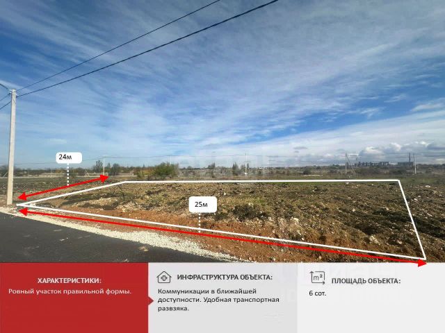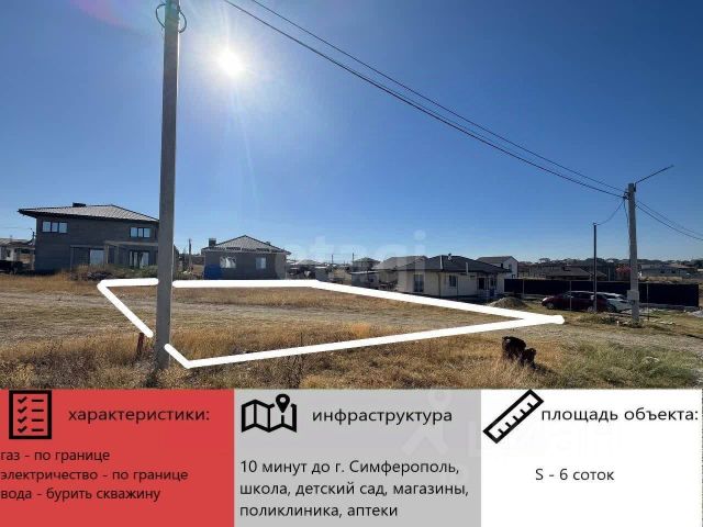 Участок в одном из самых востребованных сейчас районов! Предлагаем приобрести 6 соток ИЖС в с. Мирное. Участок ровный, прямоугольной формы. Отлично подойдет под строительство. Тихое, спокойное место. Соседи уже давно проживают. До автобусной остановки метров 50. Газ подведен к границе участка . Имеется лицевой счет на электроэнергию. Хорошие подъездные пути, грунтовая дорога 20 мм, далее везде асфальт. Груши, яблони, черешня скучают без хозяина! Такое приобретение - это отличные инвестиции! Цена на участки в этом районе постоянно растет. Остались вопросы, звоните! Проведём показ в кратчайший срок! Номер объекта 2749677 МЫ ГАРАНТИРУЕМ ФИНАНСОВУЮ БЕЗОПАСНОСТЬ ДЛЯ НАШИХ КЛИЕНТОВ. Полное юридическое сопровождение сделки. Высокий шанс одобрения ипотеки. Звоните, с удовольствием ответим на ваши вопросы! Код пользователя: 94958 Номер в базе: 2749677 Продается участок 6 соток в селе Мирное Симферопольского района.