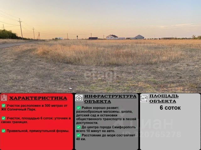 Арт. 127906576 Ваша крымская мечта начинается здесь. Не участок, а будущая жизнь у моря. Представьте утро. Вы выходите на террасу своего дома, вдыхаете свежий, солоноватый воздух, а до шума прибоя — всего десять минут неспешной прогулки. Вы уже на море. Ваш мир — это шепот волн, бескрайние горизонты и закаты, от которых замирает сердце. Это не фантазия. Это — ваш будущий адрес: посёлок Николаевка, в самом сердце Крыма. Здесь ваш дом станет не просто стенами, а источником счастья и свободы. Ваш ключ к идеальной жизни: 6 соток земли, ровных и готовых принять уютный дом, просторную усадьбу или перспективный инвестиционный проект. Участок четко оформлен, с единственным собственником — никаких сложностей, только чистые эмоции от создания своего пространства. Всего 1 км до моря. Ваши вечера могут заканчиваться прогулкой по чистому песчано-галечному пляжу, а лето — превратиться в бесконечный праздник для вас, ваших детей и гостей. Не "глухомань", а жизнь в полном цвете. В 500 метрах — вся инфраструктура курортного посёлка: магазины, кафе с видом на море, рынки со свежайшими фруктами, парки и детские площадки. Школа, сад, медпункт — здесь есть всё для комфортной жизни круглый год. Коммуникации — вопрос ближайшего будущего. Электричество уже на подходе, а газ и вода будут подведены в обозримые сроки (конец 2025 — начало 2026 гг.). Вы приобретаете не просто землю, а билет в готовящийся к новому уровню комфорта посёлок. Связь со всем Крымом. Всего 20 минут — и вы в Симферополе. Отсюда легко добраться до любого уголка полуострова, но возвращаться вы всегда будете сюда, в свой тихий, уютный мирок у моря. Почему это — гениальное решение прямо сейчас? Для души: Постройте дом своей мечты, где каждая комната наполнена светом, а из окон открывается вид на сад, который вы вырастите сами. Жить там, где другие отдыхают — это бесценно. Для ума: Николаевка — динамично развивающийся курорт. Пока инфраструктура выходит на новый уровень, вы получаете шанс войти в историю этого места по самой привлекательной цене. Рост стоимости — это не предположение, а закономерность. Для сердца и кошелька: Этот дом может стать не только вашей крепостью, но и источником дохода. Сдавайте его сезонно туристам, которые ценят тишину, море и развитую инфраструктуру в шаговой доступности. Это предложение — для тех, кто не ищет, а находит. Для тех, кто верит, что лучшая инвестиция — это инвестиция в качество своей жизни. Не откладывайте мечту. Цены на кусочки рая в перспективном Крыму не стоят на месте. Звоните прямо сейчас! Организуем для вас особенный показ. Приезжайте, вдохните этот воздух, пройдитесь до моря и почувствуйте: это — ваше. Ваша жизнь на берегу Чёрного моря ждет своего начала.