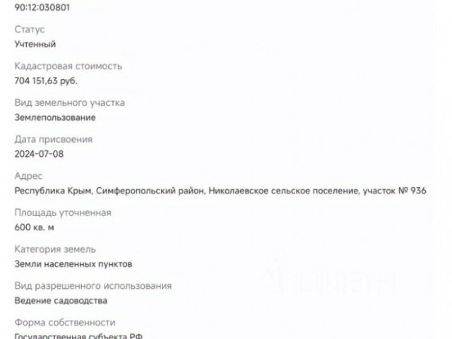 Срочная продажа! Цена актуальна только на неделю Описание: Продаётся земельный участок площадью 6 соток пгт Николаевка, Симферопольский район, Республика Крым. Участок расположен в категории земли населённых пунктов, назначение — землепользование. Кадастровый номер: 90:12:030801:4672. Участок учтён в Росреестре Ровный рельеф, удобный подъезд. Тихое место, при этом хорошая транспортная доступность — до Симферополя около 20 минут. Отличный вариант под строительство дома, дачи или как инвестиция в землю в быстро развивающемся районе. Документы полностью готовы к сделке. Продажа срочная, цена снижена и актуальна только на одну неделю! Звоните — покажу участок в удобное для вас время.