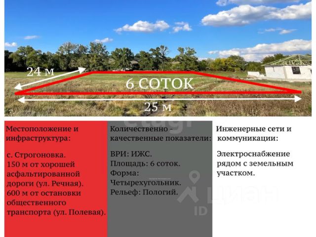 В продаже земельный участок под ИЖС, площадью 6 соток, расположенный в Строгоновке, с очень привлекательным местоположением!!! Земельный участок расположен в 150 м от хорошей асфальтированной дороги (ул. Речная) и в 600 м от остановки общественного транспорта (ул. Полевая). Удобная транспортная доступность, хорошие подъездные пути. Земельный участок ровный, без уклона, четырехугольной формы, площадь - 6 соток. ВРИ - ИЖС. Электроснабжение и водоснабжение рядом с земельным участком!!! В непосредственной близости имеется вся инфраструктура! Рядом уже построены новые дома. Документы на земельный участок оформлены в соответствии с законодательством РФ. Отдельно наша компания предлагает подряд на строительство дома под ключ в срок от 2 до 6 месяцев на эксклюзивных и самых выгодных условиях от ведущих строительных компаний Крыма. При строительстве дома можно воспользоваться ипотекой, материнским капиталом, жилищным сертификатом. Есть возможность скорректировать планировку типового проекта с учетом Ваших индивидуальных потребностей. В настоящее время действуют акции и скидки, о деталях которых Вы можете узнать, позвонив нам! Номер объекта: 3470643. МЫ ГАРАНТИРУЕМ ФИНАНСОВУЮ БЕЗОПАСНОСТЬ ДЛЯ НАШИХ КЛИЕНТОВ. Полное юридическое сопровождение сделки. Высокий шанс одобрения ипотеки. Звоните, с удовольствием ответим на ваши вопросы! Код пользователя: 92806 Номер в базе: 3470643