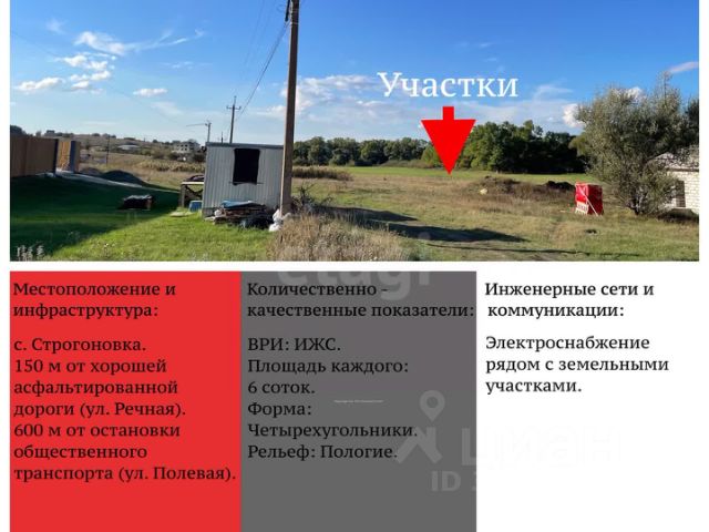 В продаже земельные участки под ИЖС, площадью 6 соток каждый, расположенные в Строгоновке, с очень привлекательным местоположением!!! Земельные участки расположены в 150 м от хорошей асфальтированной дороги (ул. Речная) и в 600 м от остановки общественного транспорта (ул. Полевая). Удобная транспортная доступность, хорошие подъездные пути. Земельные участки ровные, без уклона, четырехугольной формы, площадь каждого - 6 соток. ВРИ - ИЖС. Электроснабжение рядом с земельными участками!!! В непосредственной близости имеется вся инфраструктура! Рядом уже построены новые дома. Документы на земельный участок оформлены в соответствии с законодательством РФ. Отдельно наша компания предлагает подряд на строительство дома под ключ в срок от 2 до 6 месяцев на эксклюзивных и самых выгодных условиях от ведущих строительных компаний Крыма. При строительстве дома можно воспользоваться ипотекой, материнским капиталом, жилищным сертификатом. Есть возможность скорректировать планировку типового проекта с учетом Ваших индивидуальных потребностей. В настоящее время действуют акции и скидки, о деталях которых Вы можете узнать, позвонив нам! Номер объекта: 3477097. МЫ ГАРАНТИРУЕМ ФИНАНСОВУЮ БЕЗОПАСНОСТЬ ДЛЯ НАШИХ КЛИЕНТОВ. Полное юридическое сопровождение сделки. Высокий шанс одобрения ипотеки. Звоните, с удовольствием ответим на ваши вопросы! Код пользователя: 92806 Номер в базе: 3477097
