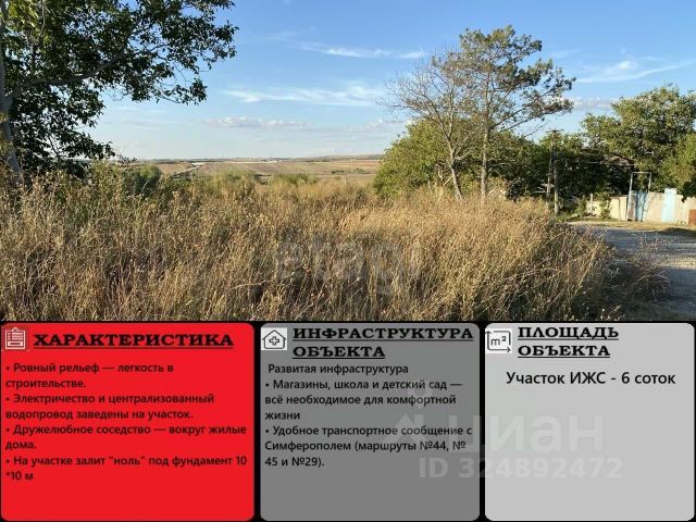 Продается участок, ИЖС, близ с. Ивановка (новая нарезка)! Площадь: 6 соток — идеальное пространство для вашего нового дома! Форма: Ровный и правильной формы — легкость в планировке и строительстве. Электричество: Всего в 100 метрах от участка — все для вашего комфорта! Уникальная нарезка по выгодной цене! Этот участок идеально подходит как для строительства вашего жилья, так и для инвестиционных целей — возможность перепродажи по более высокой цене! Удобное расположение: Всего 15 минут до Симферополя! Наслаждайтесь тишиной и природой, оставаясь в шаговой доступности от городской жизни. Безопасность сделки: Полное юридическое сопровождение и гарантия надежности! Мы поможем вам сделать лучший выбор! Не упустите шанс! Звоните прямо сейчас для получения подробной информации и организации просмотра! Ваш участок мечты ждет вас! Номер объекта: 2839806 МЫ ГАРАНТИРУЕМ ФИНАНСОВУЮ БЕЗОПАСНОСТЬ ДЛЯ НАШИХ КЛИЕНТОВ. Полное юридическое сопровождение сделки. Высокий шанс одобрения ипотеки. Звоните, с удовольствием ответим на ваши вопросы! Код пользователя: 94958 Номер в базе: 2839806