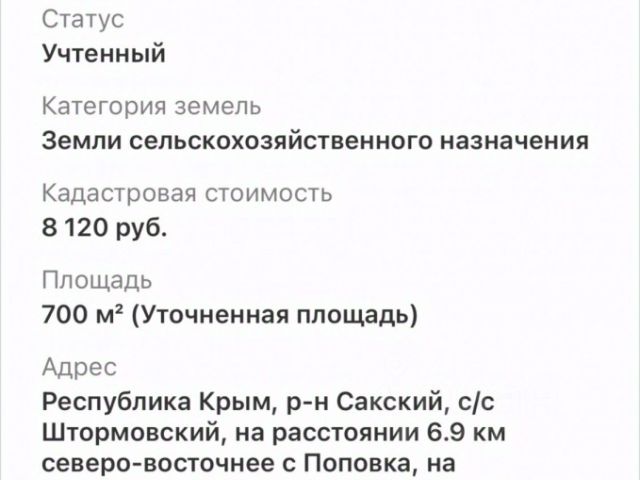 Штормовое - Ветеран Новая шикарная локация! Перспективное место! Отличное расположение: рядом с СНТ Ветеран (всего 400 м), люди живут по соседству, кругом прекрасная природа. Что есть: Свет рядом — легко подключить! Шикарная грунтовая дорога — подъезд в любое время года. До живописного озера — 700 м. До моря — всего 1.1 км по хорошей дороге! Цена на землю в этом районе растет с каждым днем! Это не просто участок, это выгодное вложение. Пока другие думают — умные уже покупают! Пишите в личные сообщения, расскажу все детали. 6 соток Кадастровый номер 90:11:240801:4969