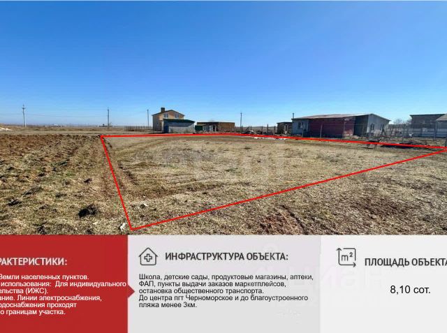 В продаже земельный участок 8,21 соток. Полностью ровный, прямоугольной формы готов для строительства дома мечты. На участке проходит газопровод, свет. С двух сторон участок закрыт забором. Рядом магазины, детские площадки, ФАП. Спокойный и тихий район. До моря на машине 5 минут. Проведено межевание и все документы готовы к продаже. Отличная цена!!! Срочная продажа` Номер объекта: #1/550309/23345