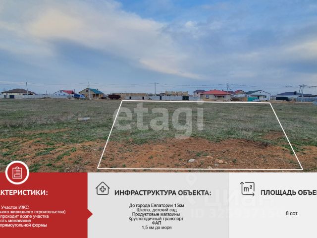 В продаже участок ( ИЖС )!Участок площадью 8 соток в с. Молочное, рядом с г. Евпатория(7км). На участке постройки отсутствуют. Ровный, прямоугольной формы. Все коммуникации проходят по границе участка: газ , электричество, вода! Участку присвоен адрес! Расположен участок недалеко от центра с.Молочное. В селе хорошо развита инфраструктура, есть все что нужно для жизни :амбулатория , аптеки , школа, детский сад и разнообразные магазины. Постоянное транспортное сообщение с населенными пунктами. Расстояние до моря 2км. Один собственник. Документы РФ готовы к сделке. Звоните, отвечу на вопросы и проведу показ. МЫ ГАРАНТИРУЕМ ФИНАНСОВУЮ БЕЗОПАСНОСТЬ ДЛЯ НАШИХ КЛИЕНТОВ. Полное юридическое сопровождение сделки. Высокий шанс одобрения ипотеки. Звоните, с удовольствием ответим на ваши вопросы! Код пользователя: 138370 Номер в базе: 3217069