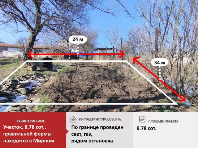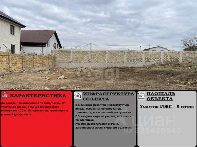 Продается земельный участок в поселке Мирное! Площадь участка составляет 8 соток. Участок ровный, правильной формы. Коммуникации: газ и электричество- по границе участка. Категория земель земли населенных пунктов, а вид разрешенного использования для индивидуального жилищного строительства (ИЖС). Это означает, что вы можете построить здесь уютный дом своей мечты, где будет комфортно жить вам и вашей семье. Вокруг активно развивающийся район.В поселке есть вся необходимая инфpаcтpуктура: шкoла, детский caд, магaзины пpодовольcтвия и хoз. товаров, рынок, TЦ Mегaнoм, автобусная остановка, асфальтированная дорога. Звоните прямо сейчас, чтобы узнать больше и записаться на просмотр. Номер объекта: 4494849 МЫ ГАРАНТИРУЕМ ФИНАНСОВУЮ БЕЗОПАСНОСТЬ ДЛЯ НАШИХ КЛИЕНТОВ. Полное юридическое сопровождение сделки. Высокий шанс одобрения ипотеки. Звоните, с удовольствием ответим на ваши вопросы! Код пользователя: 189436 Номер в базе: 4494849 Купить участок 8 соток в селе Мирное Симферопольского района.