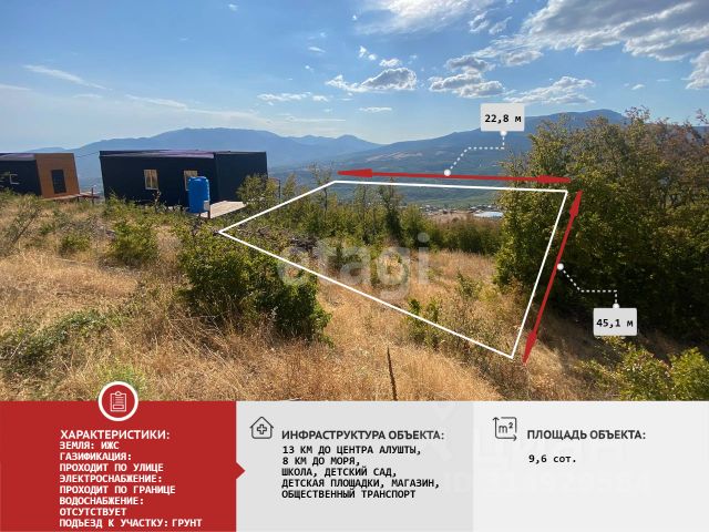 Объект 76918 | С ВИДОМ на горы. | ДО МОРЯ 7 км. | Под ИЖС. Продается земельный участок в селе Изобильное, переулок Горный (Алушта). Площадь: 9 соток. Назначение земельного участка: индивидуальное жилищное строительство (ИЖС). С участком продается часть дома в собственности 28 м2. Коммуникации: электричество, вода, газопровод по границе земельного участка. Канализация - выгребная яма. Локация: расстояние до центра села 800 м, до остановки общественного транспорта 800 м, продуктовый магазин и аптека 800 м, до Алушты 6 км. Количество собственников: один Есть возможность ипотечного кредитования.Дополнительно оплачивается комиссия покупателя в случае подбора объектов недвижимости.