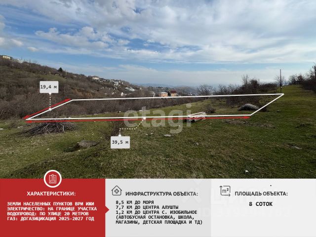 Представьте себе место, где утренний кофе сопровождается потрясающим видом на море и горы, а чистейший воздух наполняет легкие свежестью. Этот участок в селе Изобильное, переулок Горный, — идеальное место для создания вашего уютного дома или дачи, где можно наслаждаться тишиной и природой Крыма. О районе Расположен в одном из самых живописных уголков Алушты — селе Изобильное. Это место сочетает в себе спокойствие загородной жизни и близость к городской инфраструктуре. Всего несколько минут езды — и вы в центре Алушты с ее магазинами, кафе и пляжами. Переулок Горный окружен природной красотой: горы, леса и море создают уникальную атмосферу для жизни и отдыха. Об участке Площадь: 8 соток — идеальный размер для строительства дома, сада или зоны отдыха. Назначение: ИЖС (индивидуальное жилищное строительство), что позволяет построить дом вашей мечты. Размеры: 20 м х 40 м — удобная прямоугольная форма для планировки. Рельеф: Каскадный, что добавляет участку уникальности и открывает простор для креативного ландшафтного дизайна. Коммуникации: Электричество 15 кВт уже заведено на участок — можно сразу приступать к строительству. Газ проходит внизу по дороге, что упрощает подключение. По верхней границе участка, вдоль дороги, уже провели природный газ, что сделает ваш будущий дом не только теплым но и сэкономит в перспективе на отоплении. Подъезд: Удобный подъезд с двух сторон, подходящий как для легковых, так и для грузовых автомобилей, что облегчит доставку материалов и обустройство. Растительность: Участок практически свободен от деревьев и кустарников, лишь небольшие кусты в нижней части — вам не придется тратить время на расчистку. Вид: С участка открывается завораживающий панорамный вид на море и село Изобильное. Номер объекта: #1/538096/21341
