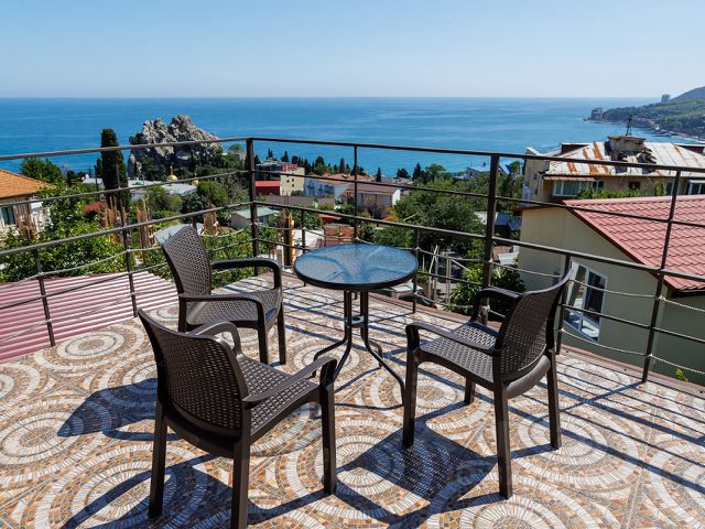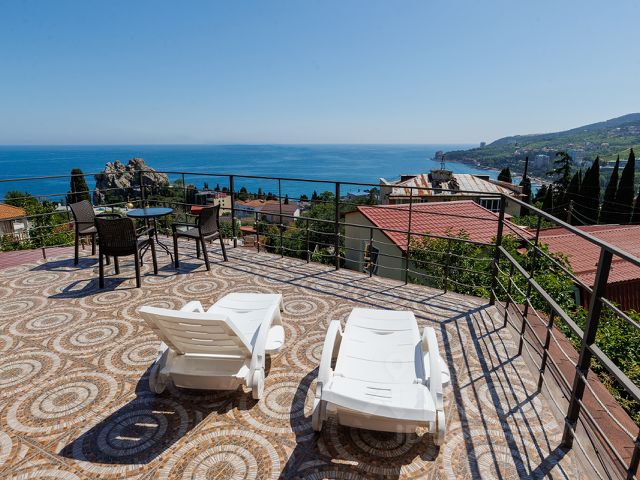 Второй этаж имеет спальню на теневой стороне дома, спальню на солнечную сторону дома, а также хозяйскую мастер спальню со своим санузлом и гардеробом. Имеет выход на террасу с которой открывается панорамный вид на всю Ялту, море и горы.