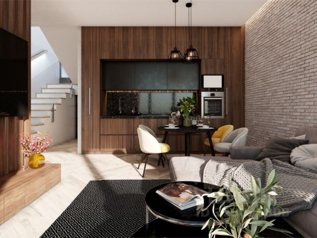 - 1-ый этаж: (90,3 кв.м.): гостиная с зоной кухни 50,6 кв.м., жилая комната 11,4 кв.м, прихожая 17,6 кв.м., санузел 6,1 кв.м., гардеробная 4,1 кв.м.;