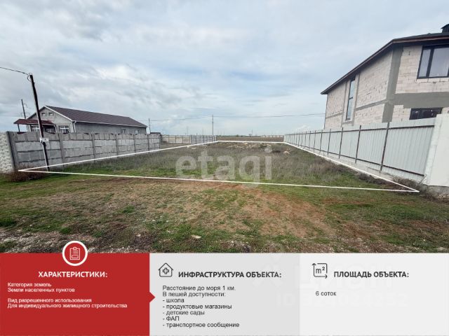 В продаже шикарный участок 6 соток ИЖС! До Тавриды, главной трассы Крыма, 5 минут 10 минут до моря 40 минут до Аэропорта и Симферополя 2.5 часа до Крымского моста Ровный участок прямоугольной формы. По улице проведено электричество и водопровод Идеальное место для строительства своего частного дома Успейте приобрести шикарную землю, как инвестиции в будущее, так и как место для постройки недвижимости в тихом районе, рядом с морем и главной транспортной артерией Крыма!