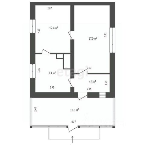 Планировка дома рассчитана на жилую площадь 60 кв.м (гостиная 31,48 кв.м, спальня 14.03 кв.м и 13.91 кв.м), кухню 7.29 кв.м, санузел 6,61 кв.м и террасой 16.78 кв.м . Гостиная с выходом на кухонную зону, санузел раздельный, коридор. Выход из гостиной на террасу - панорамные раздвижные двери, в гостиной - действующий камин. Газ к дому подведен.