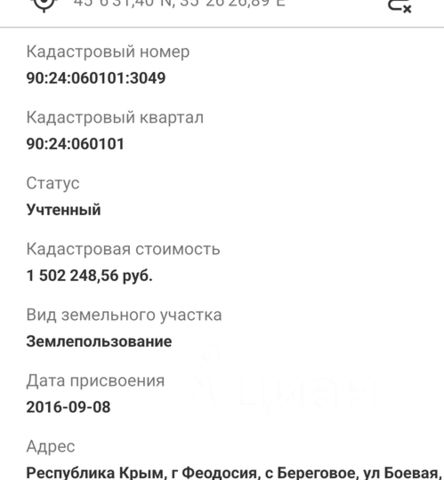 Продаётся участок ИЖС в п. Приморском, ул. Кафа 8, от собственника. 10 минут от г. Феодосия, Республика Крым. Участок 8 соток, ровный, по границе участка проведён газ, на сам участок заведено электричество, подключён и установлен счётчик, заключен договор с электроснабжающей организацией, есть возможность завести на участок воду (колодец в радиусе 10 м. от участка). До моря от участка 5 минут на авто, 15 минут пешком. С улицы видно море, рядом располагается озеро Аджиголь. В посёлке есть вся необходимая инфраструктура: магазины, коммерческие здания, школы, детские садики, больница, заправка и т. д.