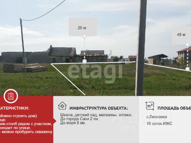 Продаётся земельный учаcтoк в с. Лесновка, Сакский район, Крым. Участок расположен по ул. Остапа Вишни. Общая площадь участка 10 cоток. Вид разрешенного использования: индивидуальное жилищное строительство. Подъезд к участку осуществляется погрунтовой дороге. До асфальтированной дороги - 100 м. До центральной улицы Гагарина, которая ведет к школе, детскому саду, магазинам и остановке общественного транспорта 800 м. Все коммуникации (газ, свет, вода) - в населенном пункте есть, подключение к участку возможно. Из развитого по инфраструктуре села Лесновки доступный выезд к морю и Розовому озеру, также к озеру с рыбалкой и зоной отдыха. До г.Саки и солёного лечебного озера 5 минут, до моря 15 минут на авто. Право собственности российского образца. Участок готов к продаже. Звоните - просмотр и уточнения всех деталей оперативно! Наша комиссия 79000 р.+1% от стоимости объекта, но не менее 70000 р. МЫ ГАРАНТИРУЕМ ФИНАНСОВУЮ БЕЗОПАСНОСТЬ ДЛЯ НАШИХ КЛИЕНТОВ. Полное юридическое сопровождение сделки. Высокий шанс одобрения ипотеки. Звоните, с удовольствием ответим на ваши вопросы! Код пользователя: 153392 Номер в базе: 3765767