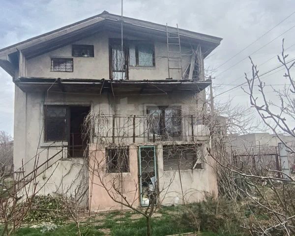 Дом в настоящее время реконструируется, готовность 80%, на первом этаже Г-образная комната площадью 39 м2, кухня - 10 м2, на втором этаже: Г-образная комната площадью 39 м2, и комната 20 м2, есть чердак и подвал, у входа - навес-оранжерея, рядом высажен виноград. В доме санузел и раковина, коммуникации заведены, установлена бочка для воды возле дома. По кадастру дом 53,5м2, как до реконструкции, обшит мягкой черепицей, внутри первого этажа частично стены обшиты террасной доской, везде дерево.