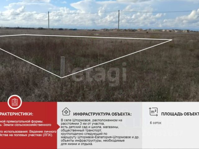 Продается участок ЛПХ площадью 6 соток, расположенный возле села Штормовое, в 1 километре от моря. Участок правильной прямоугольной формы. Категория земель: Земли сельскохозяйственного назначения. Вид разрешенного использования: Ведение личного подсобного хозяйства на полевых участках (ЛПХ). Участок оформлен в частную собственность. Межевание проведено. Участок расположен на западном побережье Крыма, известном самыми чистыми пляжами. 1 км до моря и лечебного соленого озера. 20 км до курортного города-здравницы Евпатория. В селе Штормовое, расположенном на расстоянии 3 км от участка, есть детский сад и школа, магазины, общественный транспорт, круглогодично следующий по маршруту Штормвое-Евпатория-Штормовое и др. объекты инфраструктуры, необходимые для жизни и отдыха. Документы готовы к сделке. Звоните! Буду рада ответить на Ваши вопросы и организовать показ. МЫ ГАРАНТИРУЕМ ФИНАНСОВУЮ БЕЗОПАСНОСТЬ ДЛЯ НАШИХ КЛИЕНТОВ. Полное юридическое сопровождение сделки. Высокий шанс одобрения ипотеки. Звоните, с удовольствием ответим на ваши вопросы! Код пользователя: 84414 Номер в базе: 3456205 Продается загородная недвижимость на улице Восточная в селе Штормовое.