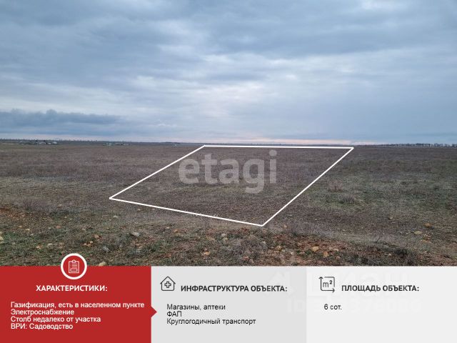 Земельный участок площадью 6 соток расположен в Сакском районе Крыма, северо-восточнее села Приветное, на территории Штормовского сельского поселения. Назначение — ЛПХ, что позволяет удовлетворение личных нужд семьи через ведение сельского хозяйства, выращивание продукции и содержание животных, и некоторые владельцы уже строят каркасные дома. Участок имеет ровную прямоугольную форму, готов к использованию: проведены агрохимические работы, почва подходит для сельского хозяйства, включая виноградарство и выращивание зерновых. В отличие от многих предложений на рынке, здесь обеспечен удобный подъезд и доступ к коммуникациям. Село Приветное имеет развитую инфраструктуру: школы, детские сады, овощные рынки, регулярное автобусное сообщение. Документы готовы к сделке, процесс оформления пройдет быстро и без осложнений. Участок подходит как для строительства дома, так и для сельскохозяйственного использования. МЫ ГАРАНТИРУЕМ ФИНАНСОВУЮ БЕЗОПАСНОСТЬ ДЛЯ НАШИХ КЛИЕНТОВ. Полное юридическое сопровождение сделки. Высокий шанс одобрения ипотеки. Звоните, с удовольствием ответим на ваши вопросы! Код пользователя: 183878 Номер в базе: 8985698