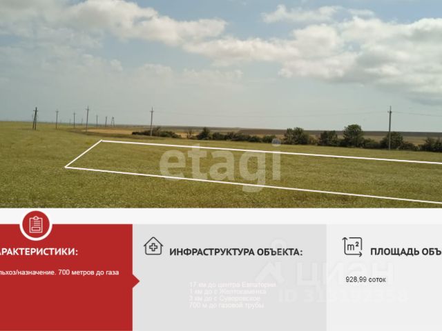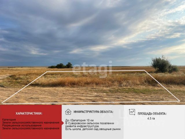Земля 11,23 гектара в Суворовском. Продается земельный участок общей площадью 11,23 га. в селе Суворовское, Сакского района. Участок не обработан, имеет ровную и прямоугольную форму. Ширина участка около 200 метров и в длину в среднем 540 метров. Категория земель: земли сельскохозяйственного назначения Вид разрешенного использования: Ведение личного подсобного хозяйства на полевых участках. Участок расположен вблизи трассы Таврида, недалеко от съезда в город Евпатория. Очень хороший вариант для инвестирования. Можно разделить на множество приусадебных участков. Звоните в любое время. Отвечу на все вопросы, включая консультации по всем видам недвижимости МЫ ГАРАНТИРУЕМ ФИНАНСОВУЮ БЕЗОПАСНОСТЬ ДЛЯ НАШИХ КЛИЕНТОВ. Полное юридическое сопровождение сделки. Высокий шанс одобрения ипотеки. Звоните, с удовольствием ответим на ваши вопросы! Код пользователя: 146770 Номер в базе: 3444401