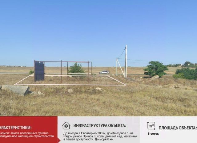 Внимание АКЦИЯ!!! При покупке двух участков по 8 соток цена 1,3 млн!!! Выгодное предложение, участки, 6, 8, 10 соток в 4 км от Евпатории и великолепного песчаного пляжа. Поселковые коммуникации по границе, недалеко от трассы. Можно ли строить дом? Согласно федерального закона 299-ФЗс с 1 марта 2022 г. на земельных участках, предоставленных крестьянско-фермерским хозяйствам разрешено строить, ставить на кадастровый учет и регистрировать права собственности. Требования к строительству жилья: на участке разрешено построить только 1 дом здание не выше 3-х этажей площадь дома не более 500 кв. м, пятно застройки должно составлять не более 0,25% от площади земельного участка Как зарегистрировать такой дом? До 1 марта 2031 года в РФ будет действовать упрощенный режим регистрации таких объектов. Для регистрации дома в Росреестр необходимо предоставить следующие документы: правоустанавливающий документ на земельный участок, технический план и декларацию об объекте недвижимости. На данном этапе участок ЛПХ, но после вхождения в границы населённого пункта будет ИЖС. Спешите приобрести по цене 2024 года, в сезон цена поднимется.