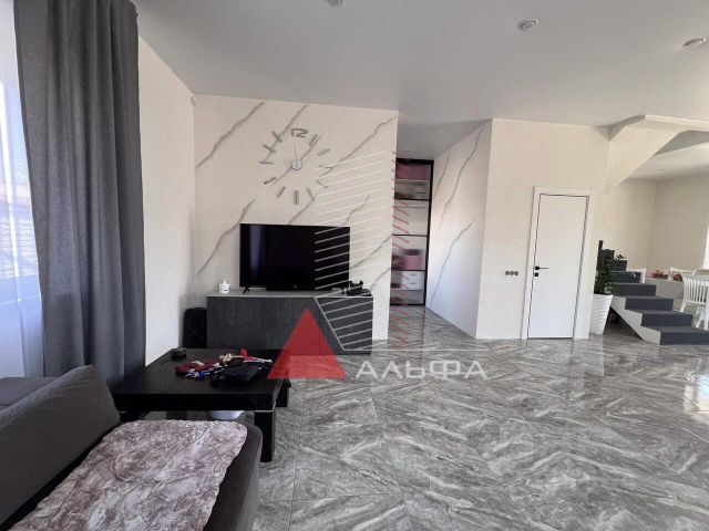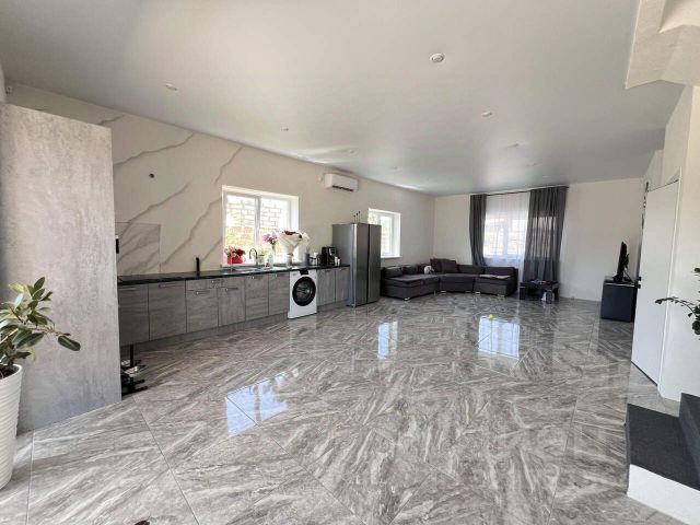 На полу в зоне кухни-гостиной и коридоре постелена новая современная плитка в спокойных тонах, в комнатах постелен ламинат, во всем доме установлена система теплый пол, матовые натяжные потолки итальянского бренда, выполнены ниши с подсветкой и хорошее освещение во всем доме.