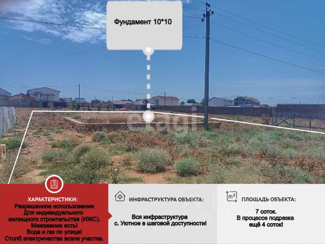 В срочной продаже участок (ИЖС) в селе Уютное, общей площадью 7 соток! Участок из старого фонда ! Категория участка : земли населенных пунктов. Назначение : индивидуальное жилищное строительство. Границы участка обозначены, неправильной формы. Чтобы выровнять участок есть возможность подрезать еще 4 сотки.На участке залит фундамент 10*10. Столб электричества возле участка.Вода и газ по улице. Уютное имеет свою развитую инфраструктуру и находиться в 2-ух км. от г. Евпатория.Участок расположен в старых границах с. Уютное .В шаговой доступности школа, новый детский сад, почта , амбулатория и аптеки, разнообразные магазины, супермаркеты и кафе.В поселении свой действующий ДК и новая ледовая арена "Наследие".Постоянное маршрутное сообщение с городом и соседними поселками.До моря 3км. Один собственник!Для реального покупателя существенная скидка! Звоните! С удовольствием отвечу на вопросы или проведу показ. МЫ ГАРАНТИРУЕМ ФИНАНСОВУЮ БЕЗОПАСНОСТЬ ДЛЯ НАШИХ КЛИЕНТОВ. Полное юридическое сопровождение сделки. Высокий шанс одобрения ипотеки. Звоните, с удовольствием ответим на ваши вопросы! Код пользователя: 151271 Номер в базе: 3416555 Загородная недвижимость на улице Юрия Гагарина в селе Уютное.