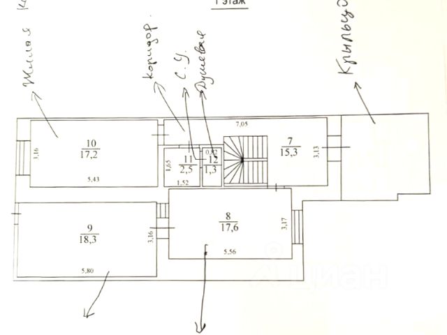 Дуплекс 2023 года постройки, в 3-уровня, общей площадью 105 м2, жилая 80 м2, цоколь 83,2 м2, три комнаты ( 17,2 м2/17,6 м2/17.2 м2), 3 с/у совмещённых (3,8 м2/ 3,8 м2/3,9 м2), коридор (15,3 м2/ 11 м2), кухня - с выходом на террасу 17,6 м2, терраса с видом во двор 18,3 м2.