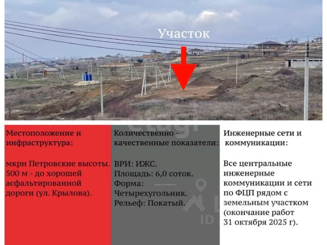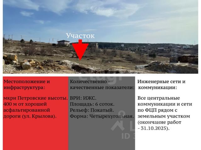 Продается участок, 6 соток, в Петровских высотах! Ищете идеальное место для строительства дома или выгодного вложения? У нас есть отличное предложение! • Площадь: 6 соток • Форма: Правильная, ровная • Расстояние до Симферополя: всего 3 минуты • Электричество: Линия электропередач проходит по границе участка Это прекрасный вариант как для удачного вложения, так и для строительства вашего дома мечты. Мы обеспечиваем полное юридическое сопровождение и гарантируем безопасность сделки! Не упустите возможность создать свое идеальное пространство! Звоните для получения дополнительной информации! Номер объекта: 4312451 МЫ ГАРАНТИРУЕМ ФИНАНСОВУЮ БЕЗОПАСНОСТЬ ДЛЯ НАШИХ КЛИЕНТОВ. Полное юридическое сопровождение сделки. Высокий шанс одобрения ипотеки. Звоните, с удовольствием ответим на ваши вопросы! Код пользователя: 142214 Номер в базе: 4312451 Купить загородную недвижимость в квартале Петровские Высоты в городе Симферополь.