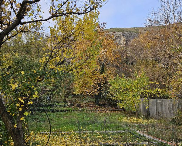 Большие добротные железные ворота, надежный каменный забор, видеодомофон, задний дворик с плодоносящими деревьями.